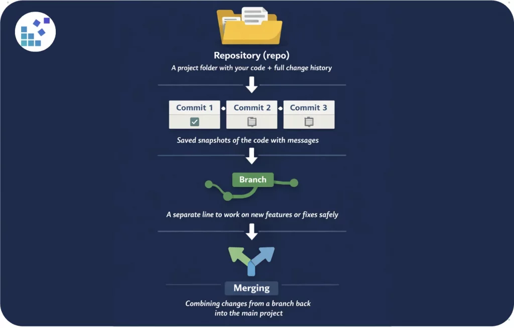 Forks, repos, stars, branches — all of this may sound a bit confusing at first. But once you understand how Git works, these concepts start to make sense. In Git, a repository holds your project and its history, commits record changes over time, branches allow parallel development, and merging combines finished work into the main project. Here’s a simple visual to help you understand the flow: