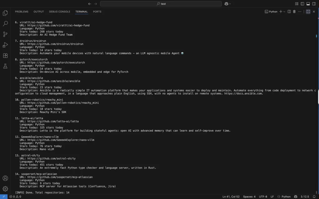 As a result, our Terminal displays a clean list of 14 trending repositories.