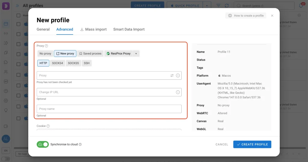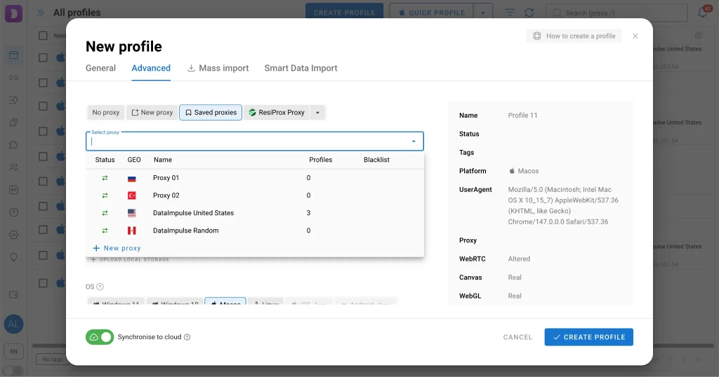 In the basic scenario, you can assign a proxy directly when creating a profile. You select the connection type (HTTP, SOCKS4, SOCKS5 or SSH), enter the credentials from DataImpulse (IP, port, login, password), run a quick connection test and save the profile. At that point, it’s already configured to operate through a dedicated IP.