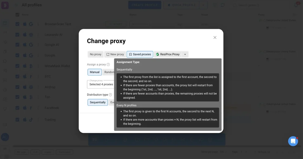 As the number of accounts grows, bulk actions become essential. Dolphin Anty lets you assign proxies to multiple profiles at once through the bulk edit menu. You can distribute proxies manually for precise control, randomly for more natural allocation, or based on a pattern, for example, assigning a new proxy to every Nth profile.