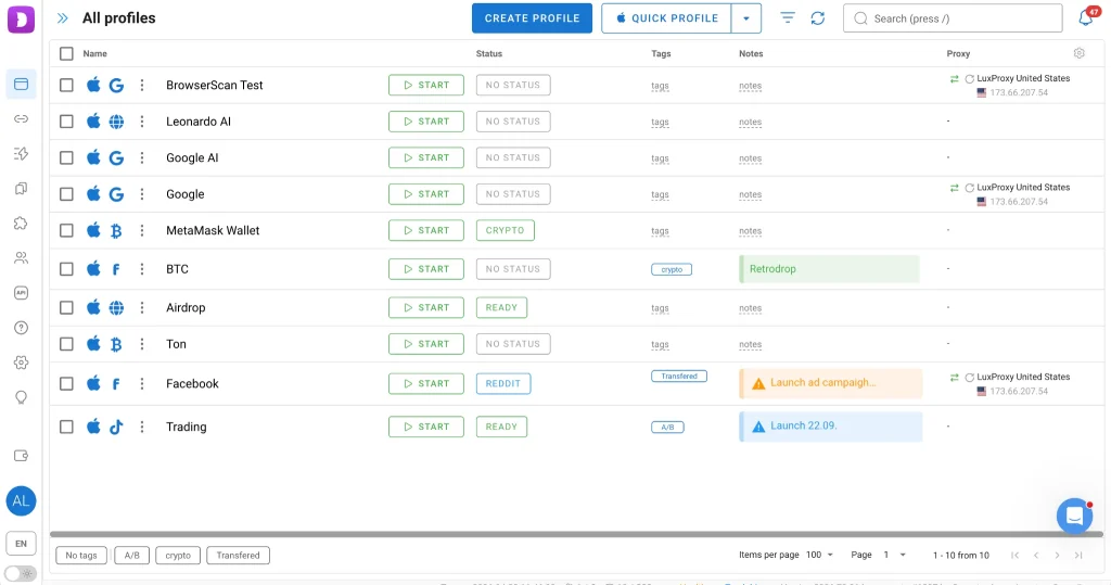 As the number of profiles increases, the main challenge shifts from creation to management. Dolphin Anty provides tools to organize profiles with tags, statuses, and notes, making it easier to navigate large setups without losing track of account states.