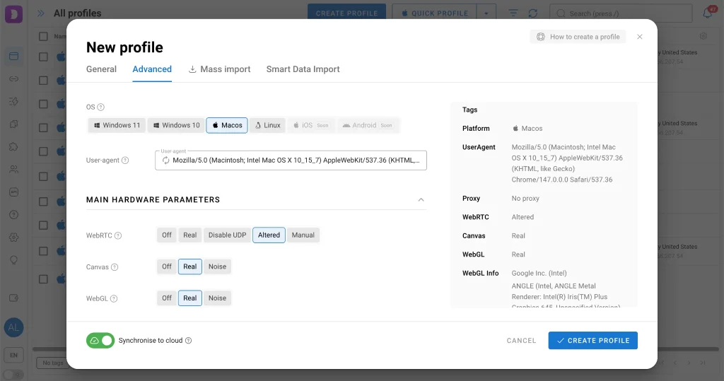 Each profile includes a full set of parameters: user-agent, WebGL, fonts, timezone, language, and more. These values are not random: they are aligned to form a consistent digital identity. This matters because modern antifraud systems don’t rely on a single signal and evaluate the entire fingerprint as a whole.