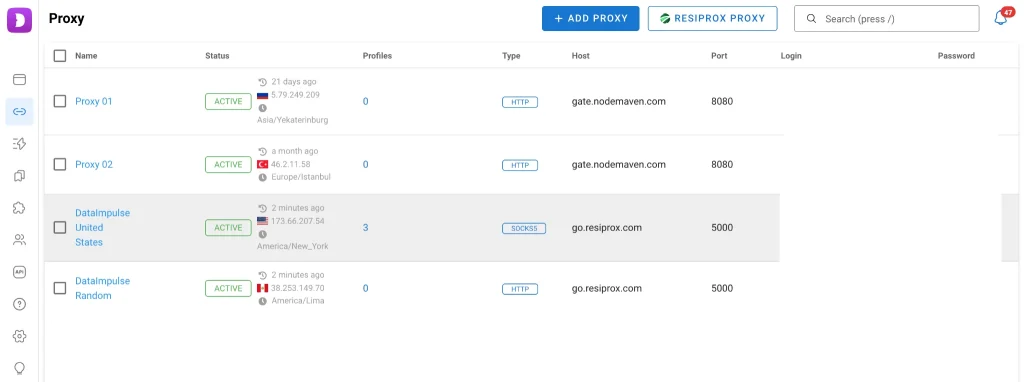 When working with a larger number of proxies, this approach quickly becomes inefficient. That’s where the built-in Proxy Manager comes in. It allows you to store all DataImpulse proxies in one place and manage them as a list. Instead of adding proxies one by one, you can import them in bulk, which is especially useful if you already have a prepared proxy pool.