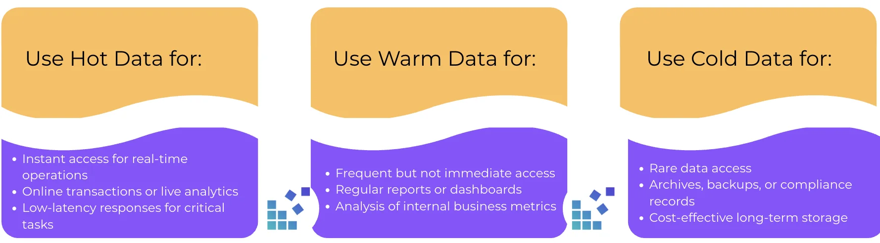 Not all data is categorized as either “hot” or “cold”. Between these two extremes, we have a middle layer in a tiered storage architecture — warm data. It is information that isn’t needed instantly but still requires reasonably quick access. Warm data is typically accessed periodically: more often than cold archives but less frequently than hot datasets. For example, for recently created analytics reports, logs, customer data, media, and any files that are viewed occasionally and remain relevant for weeks or months. As a result, warm storage aims to deliver a balance between speed and affordability.