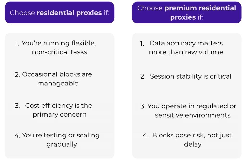 If your workflow can handle occasional retries, minor blocks, or small data gaps, standard residential proxies will get the job done. But when retries trigger alarms, break sessions, or introduce risk, premium proxies become the smarter choice.