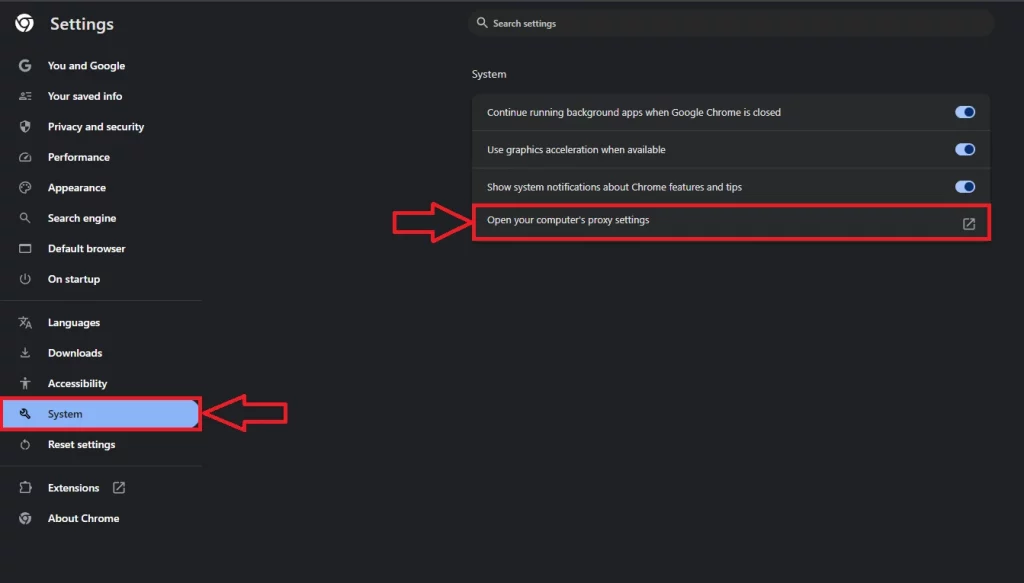 • Then navigate to “System” > “Open your computer’s proxy settings.