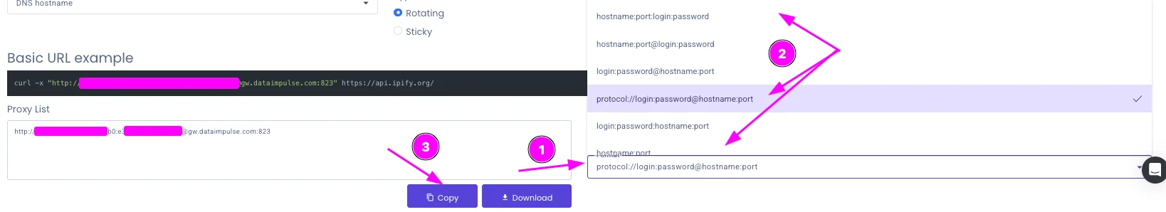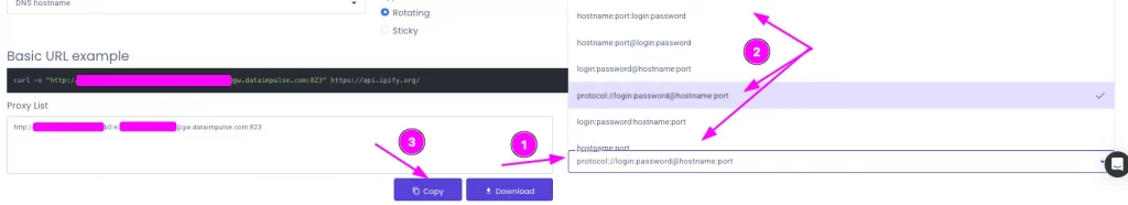 9. You’ll see the supported proxy formats. You can use a preferred one. To use proxy credentials, go to your DataImpulse dashboard, open your plan, scroll down to Proxy List and format section. Choose protocol://login:password@hostname:port format and click ‘Copy’ to save the proxy details.