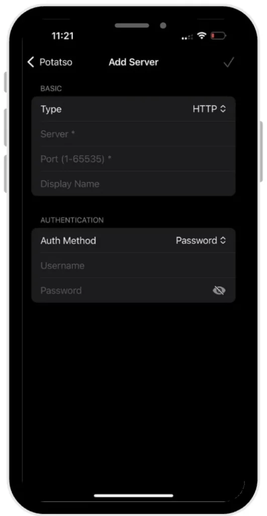 4. Complete all the necessary details in the Basic section. To manually configure a proxy, choose PASSWORD in the Authentication section and provide the following information: