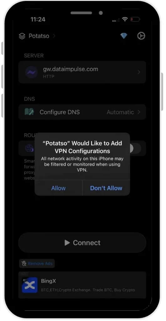 If this is your initial experience with Potatso, you could receive an iOS notification requesting the addition of Potatso to your VPN settings, along with the installation of the relevant VPN profile. Just tap “Allow” and you’ll be prompted to enter your iPhone passcode to confirm.