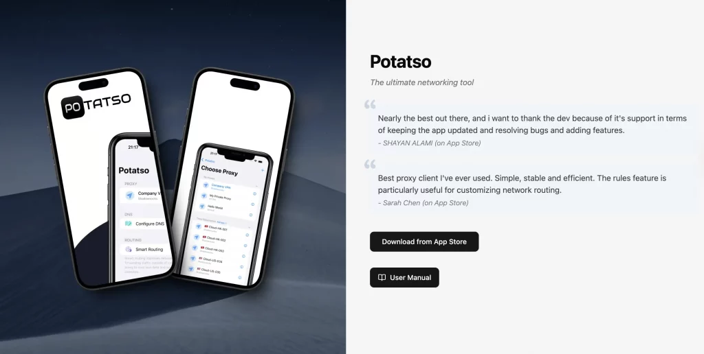 Potatso is a free network app for creating a clean network environment and making your mobile operations more stable. Users can manage traffic, configure proxy settings, and monitor network activity directly from their device. Potatso app is available for Apple devices, in particular iPhones and iPads.
