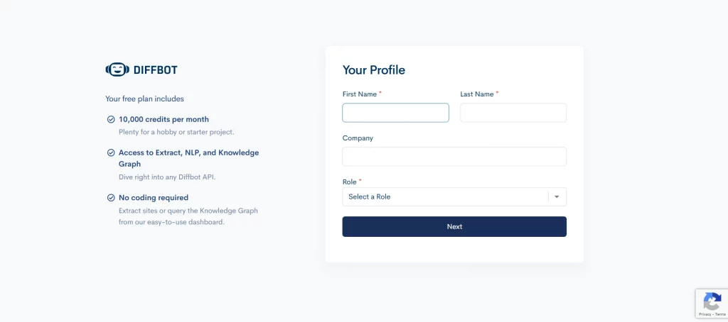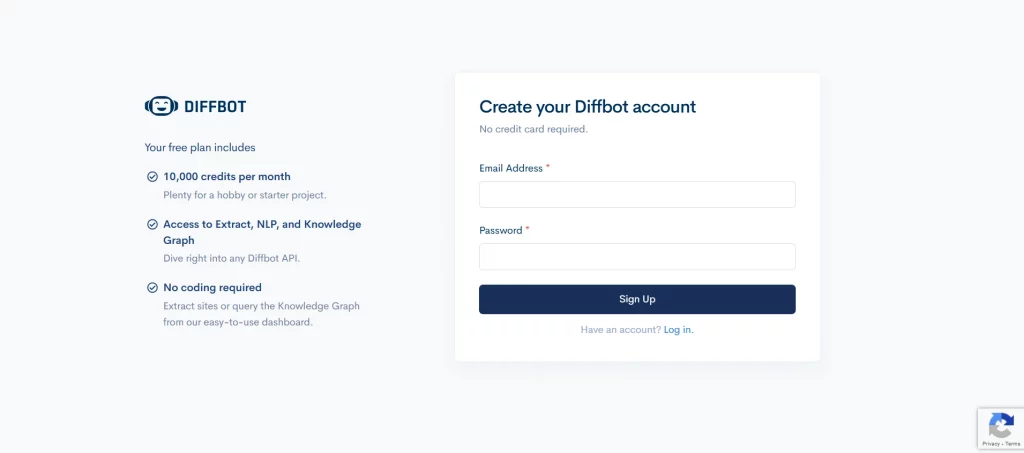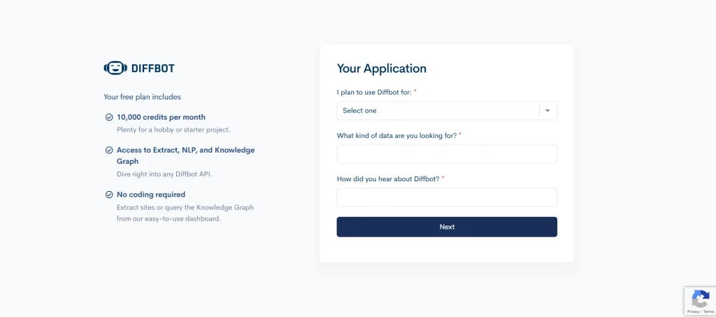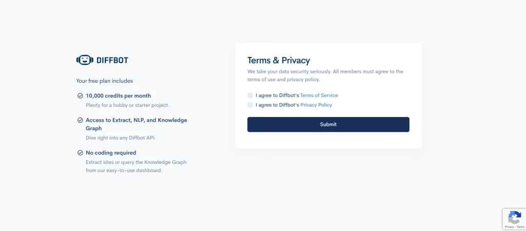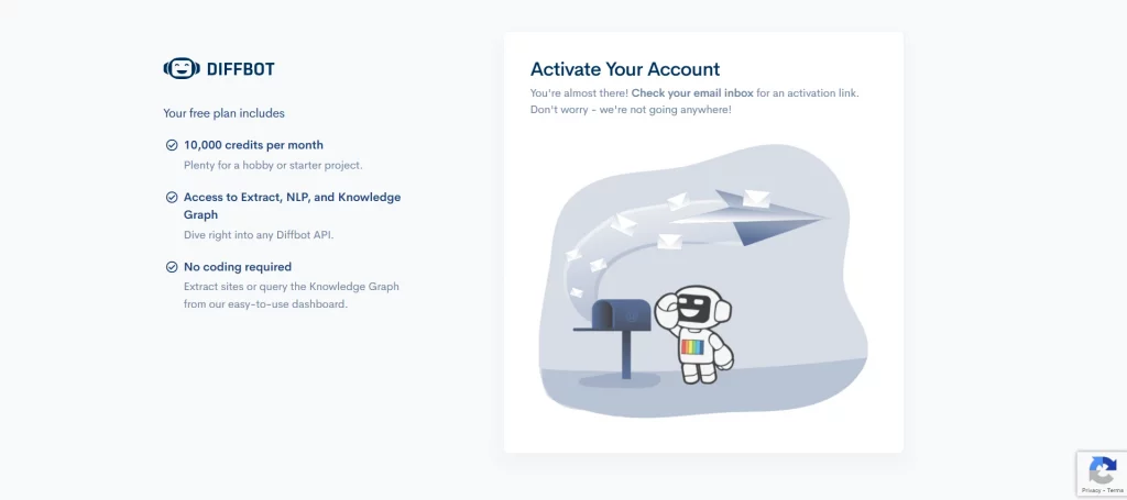 First, you need to create an account. The process is intuitive and straightforward and will only take several minutes. Diffbot will ask you several questions. In the end, don’t forget to read the ToS and Privacy Policy and tick boxes to confirm that. Also, you will have to visit your email and follow a link to activate your account.