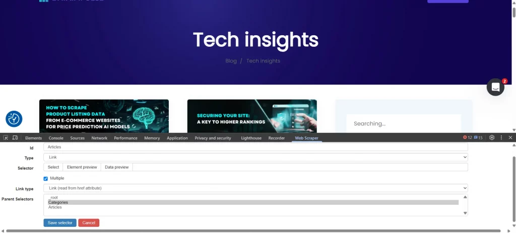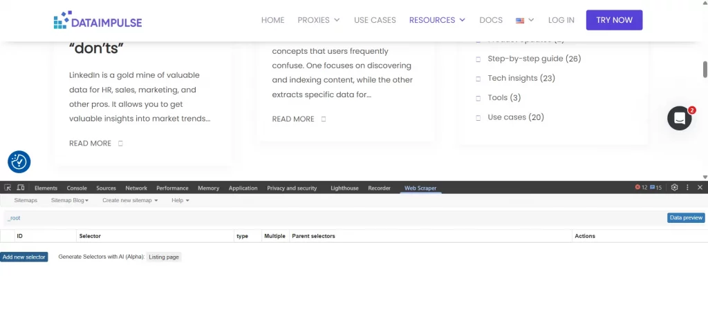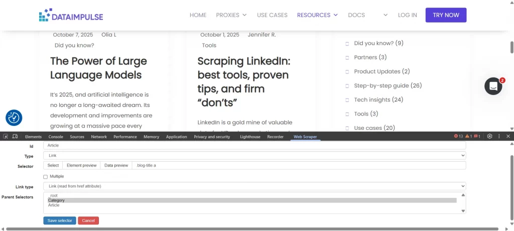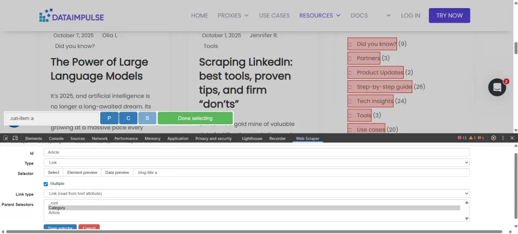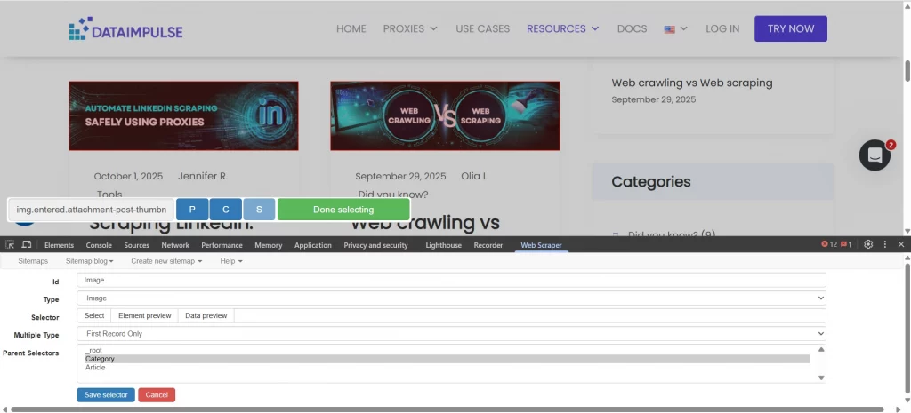 - Now we need to create selectors. Press Add new selector, then fill in its name, choose a type, and check “Multiple” as you will get several items. Then press Select and click on the elements you want to scrape. You don’t need to choose all the elements manually – click two elements of the same type and the extension will catch up automatically. When it’s ready, press Done selecting. You can check whether it’s all working by using Data preview. To finalize, click Save selector. In our example, we start with categories, so we click on the names of two categories, and the extension does the rest itself. Then we want the tool to scrape all the articles in all the categories, so we go to one of them. Next, we click on our existing selector and create another one under it, repeating the steps from above. You can create as many selectors as you wish. Note: dataimpulse.com has multiple levels of pagination, and we need a subcategory to be executed under a category, which is why we clicked on a selector before creating a next one. You may skip entering a root selector if you don’t need that.