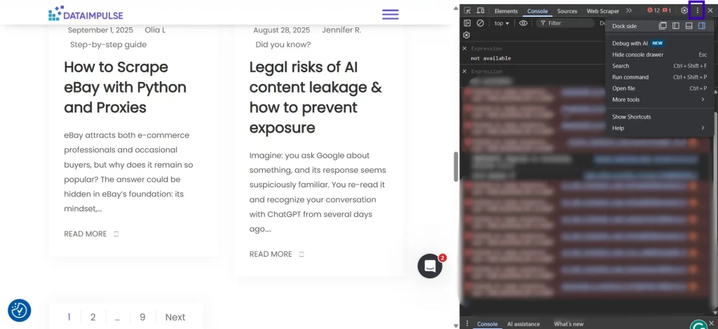 - Launch Developer Tools (Fn+F12 for Windows/Linux or Option + ⌘ + I for Mac). Then, go to the Web Scraper tab. You may need to move Developer tools to the bottom of the browser to start using the extension. To do so, go to the Console tab, click on the three vertical dots, and choose the necessary option in the Dock side section.