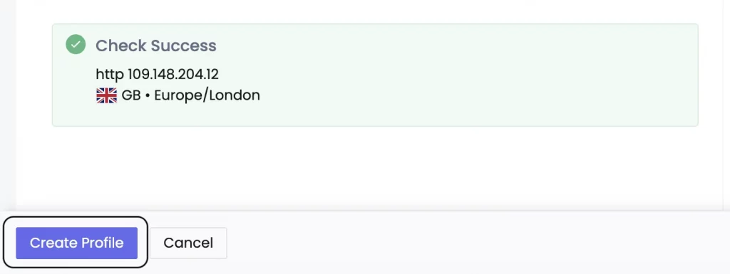 7. The next step is to check if your proxy works as needed. Choose IP checker from the drop-down menu, and click Check Proxy. You can also check IP and browser details in the Advanced Settings. After all these steps, click Create Profile.