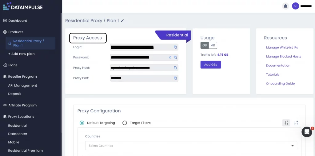 1. First of all, sign up for DataImpulse and start using the features on your dashboard. Go to the Proxy section and choose the plan you need. Make a note of the proxy credentials (login, password, host, port) provided by DataImpulse. We’ll need this info for the next steps.