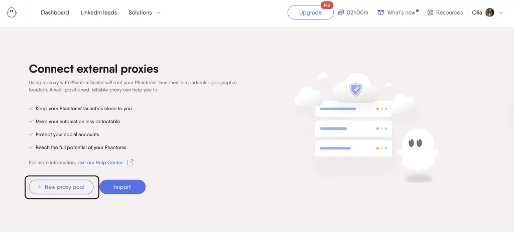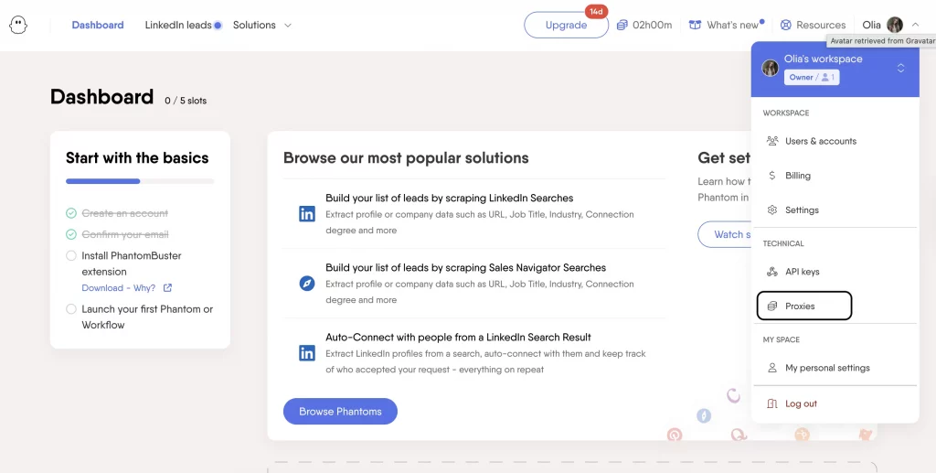 4. On your PhantomBuster dashboard, go to your profile and click Proxies from the technical menu.